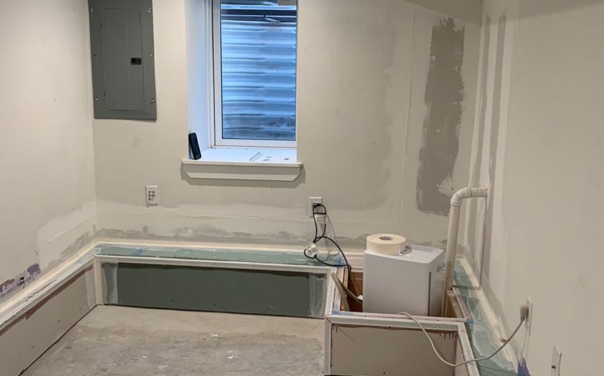 To start, we focused on fixing damaged drywall throughout the basement. There were cracks and uneven areas on the walls and ceilings. Because of this, our team carefully cut out and removed each damaged section. Then, we patched the problem spots, applied fresh mud, and smoothed everything out. After drying completely, we sanded the surfaces and added a fresh coat of paint. This gave the room a bright, clean finish.