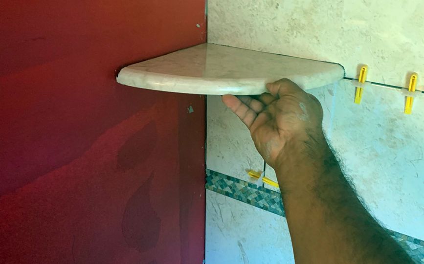 Furthermore, we upgraded the shower walls with new tile for a polished look. We also added custom-built shelving to increase storage without taking up extra space. The tile and shelving worked together to boost both function and style.